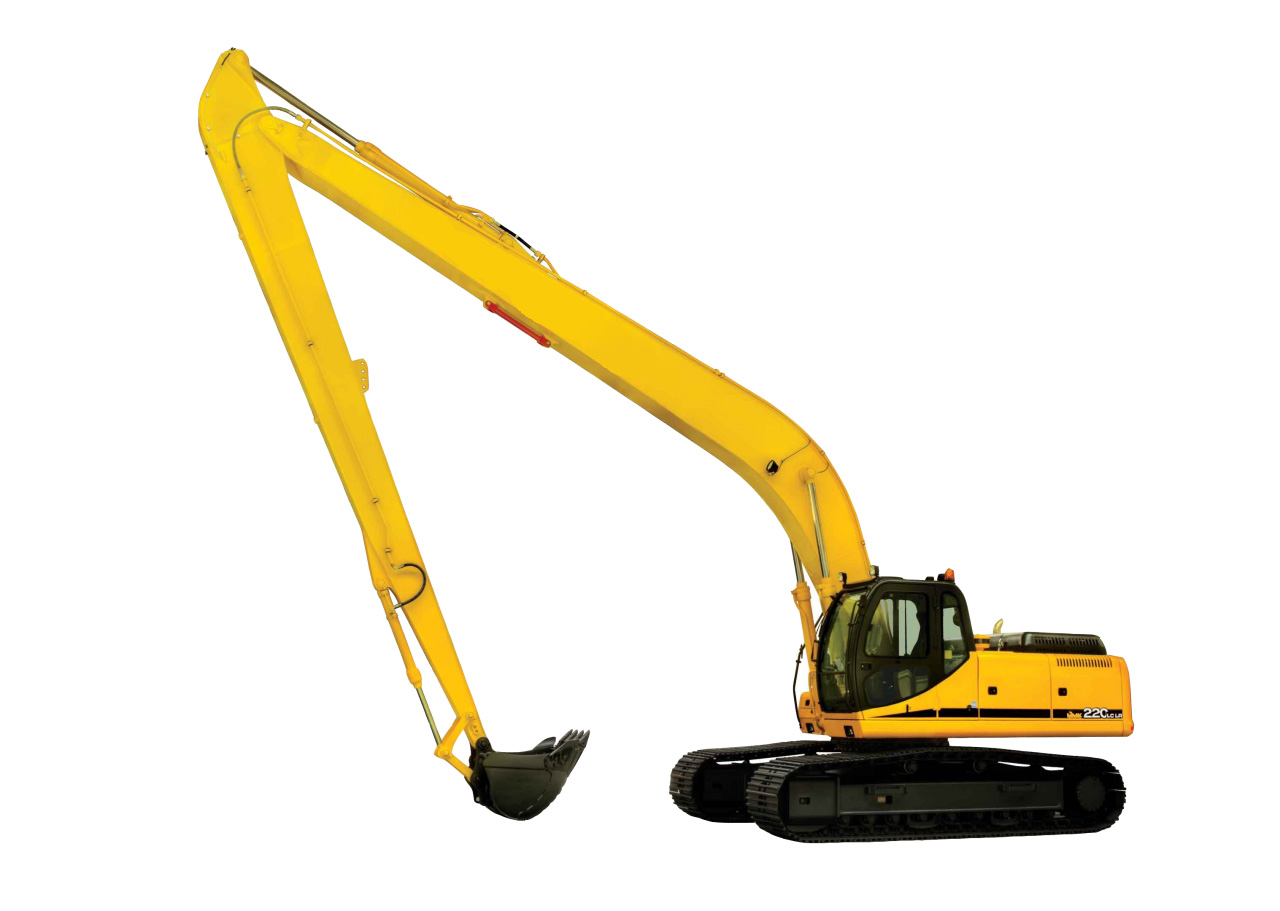 Long reach excavator features a long length arm and boom sections. The design allows for better operation in hard to reach locations. The excavator's extendable arm horizontally.